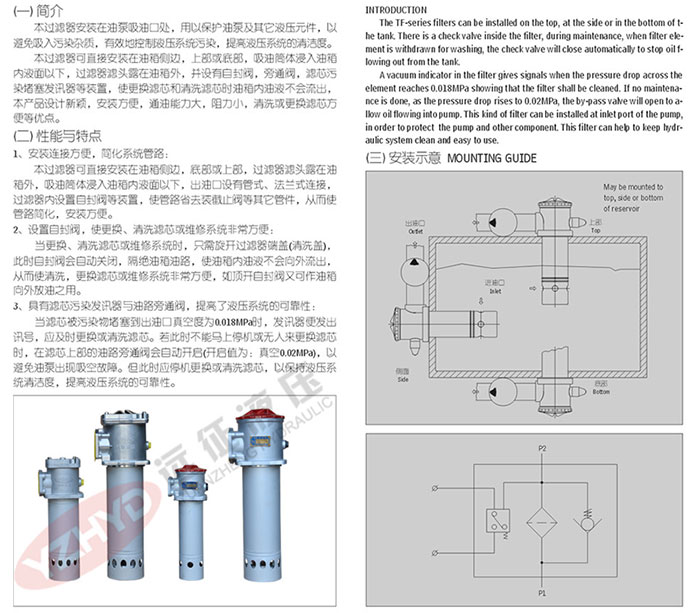 溫州遠征液壓有限公司是一家集開發(fā)、生產(chǎn)、服務(wù)于一體的綜合性企業(yè),是國內(nèi)生產(chǎn)液壓輔件(液壓配件_液壓過濾器)的專 業(yè)廠家,長期以來為冶金、石油、礦山、工程、建筑、塑機、化工、機床、交通等行業(yè)的液壓設(shè)備提供配套,同時為引進設(shè)備提供高品質(zhì)的國產(chǎn)化備件。今天遠征主講TF系列箱外自封式吸油過濾器(新型結(jié)構(gòu)代替LXZ系列),詳情請看下圖: