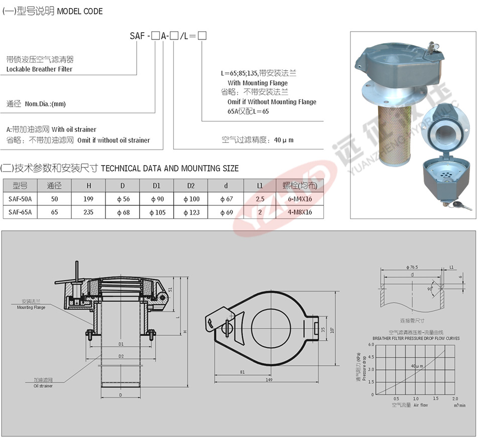 SAF系列帶鎖液壓空氣濾清器特性: